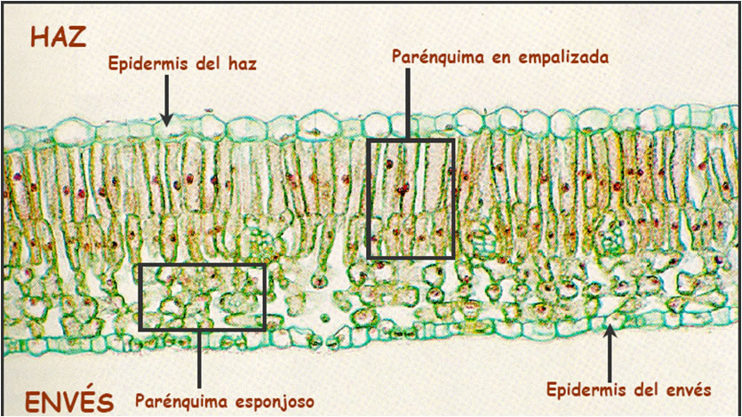 - Hacia el envés el parénquima se hace laxo, con muchos espacios intercelulares y las células son más redondedas: parénquima esponjoso o lagunar.